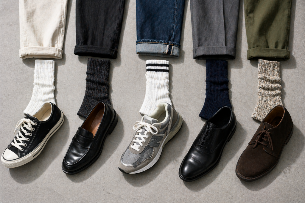 また、靴の種類に合わせた靴下選びや、丈のバランスを意識することで、コーディネートの見え方はさらに洗練されていきます。