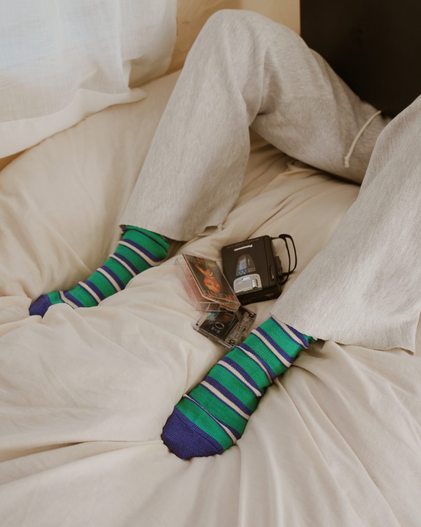 トップスや小物と靴下の色をリンクさせることで、コーディネートに自然なまとまりが生まれます。