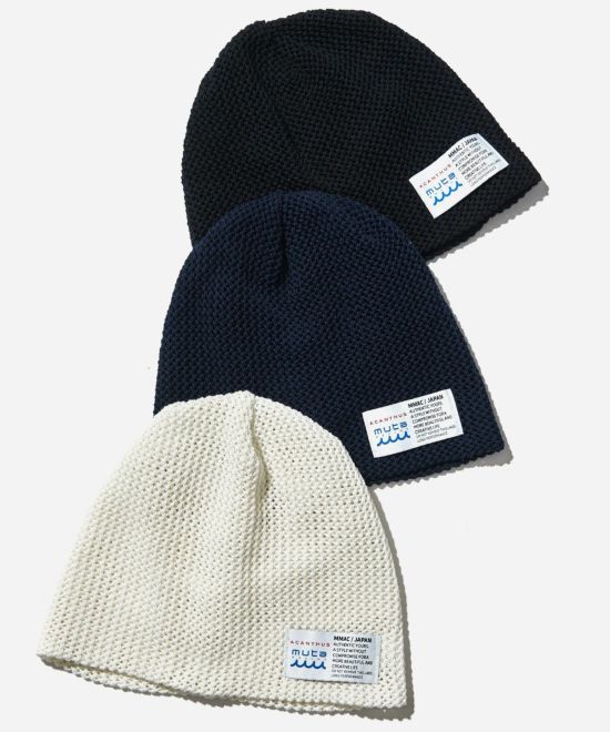 クオリティの高い国内工場にて編み立てたニットキャップ。メッシュ構造を採用した編み方が特徴で暑い時期でも快適な被り心地を実現しています。バックにはつまみを入れて、程よくルーズで立体感のある被り方が可能です。フロントにはコラボレーションデザインの織りロゴネームを配置しています。