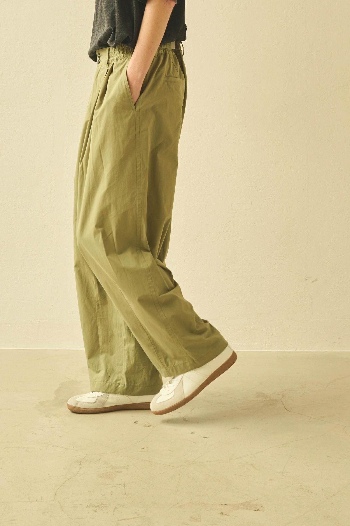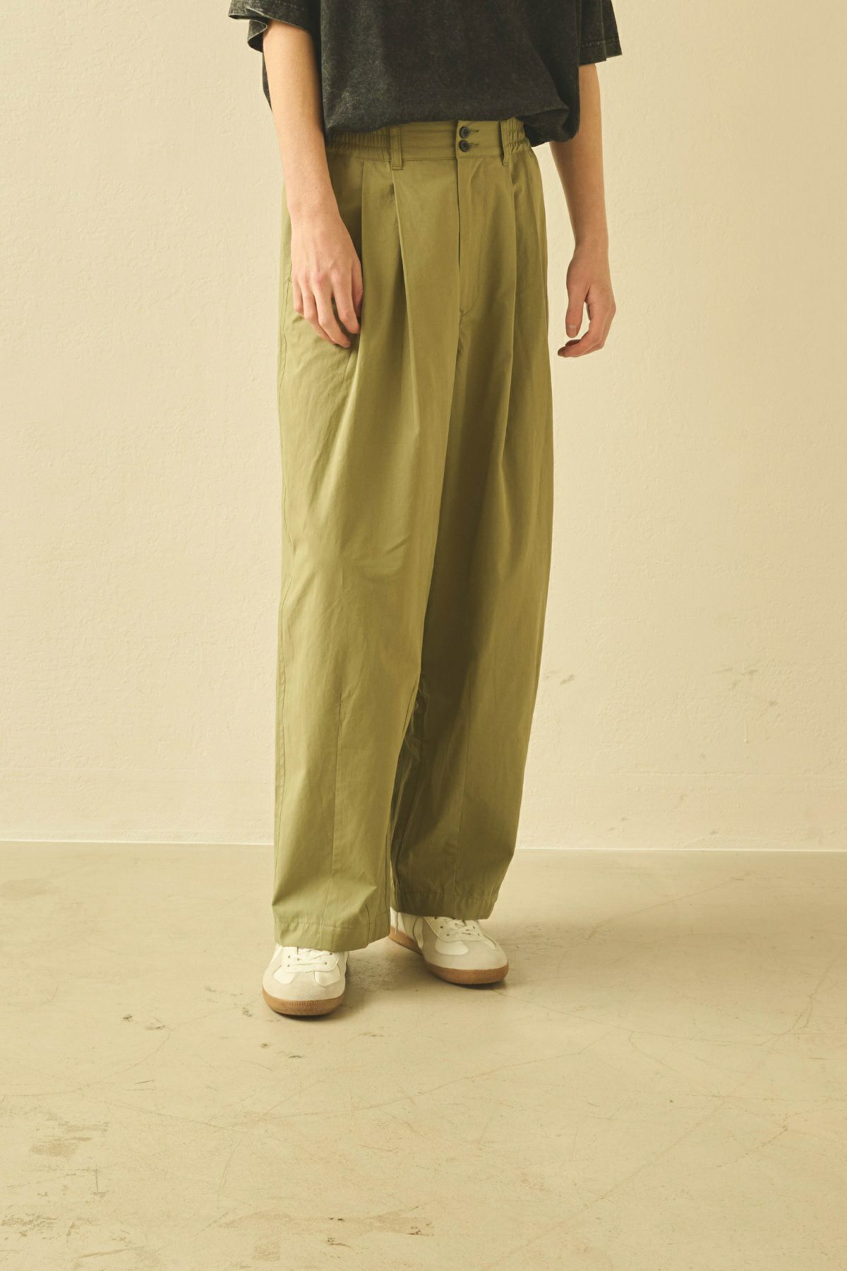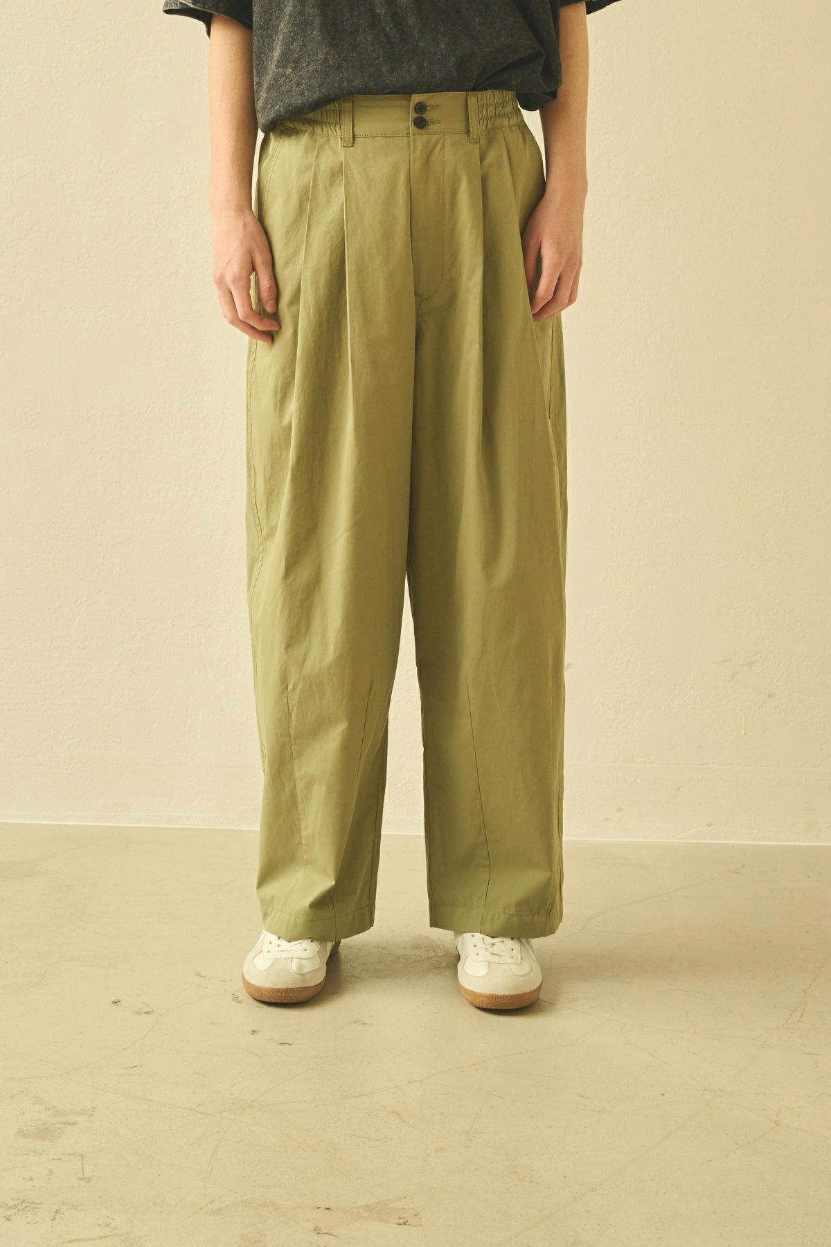 サイドのシルエットラインをコクーンに膨らませたゴム入り2タック。