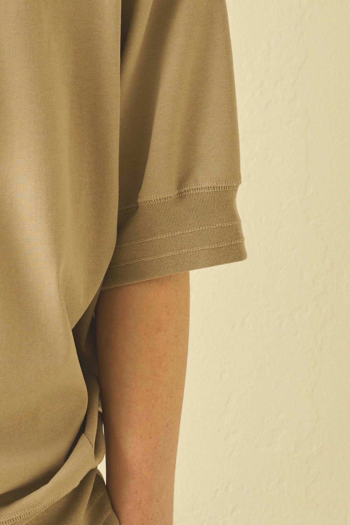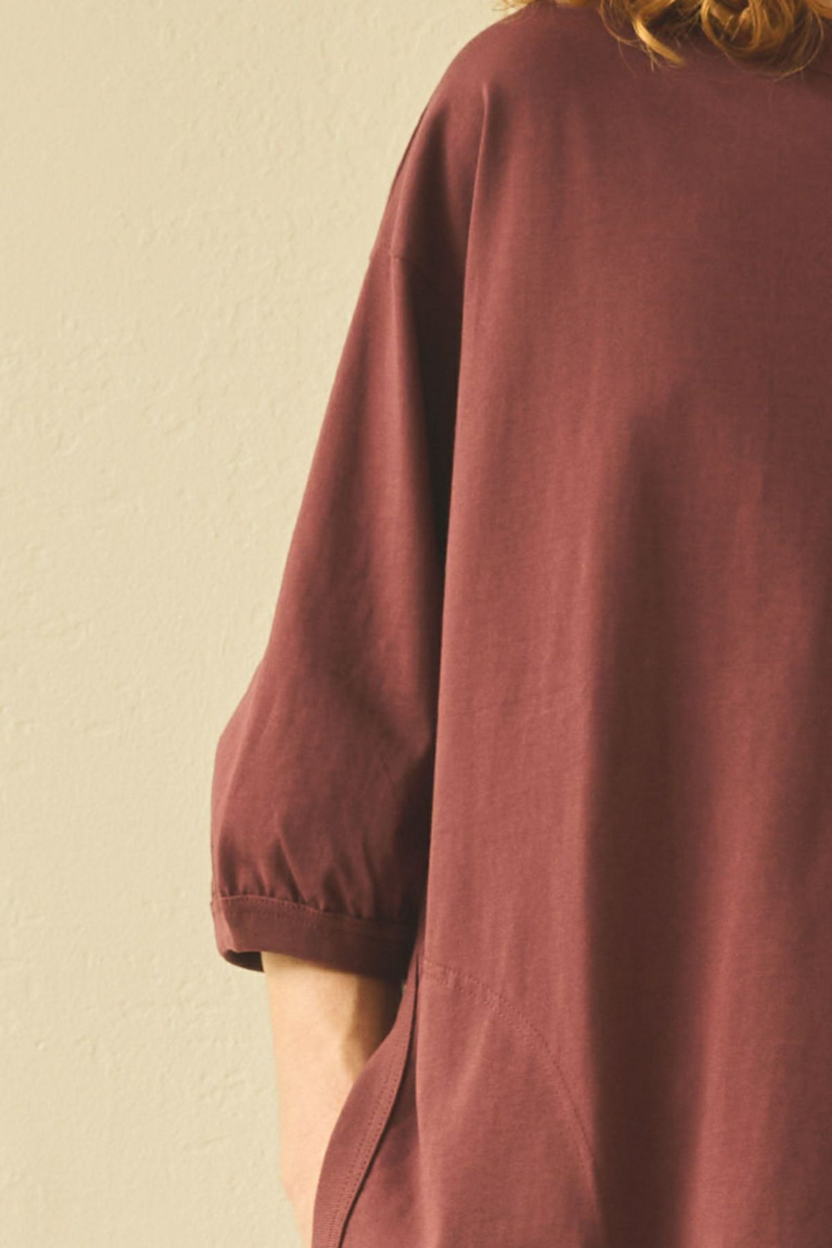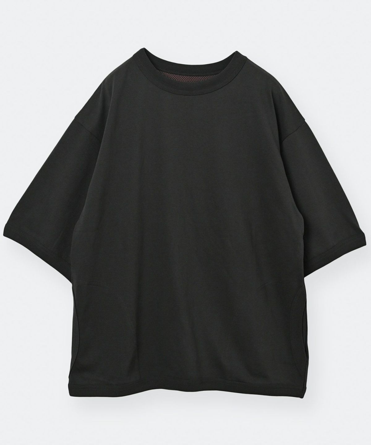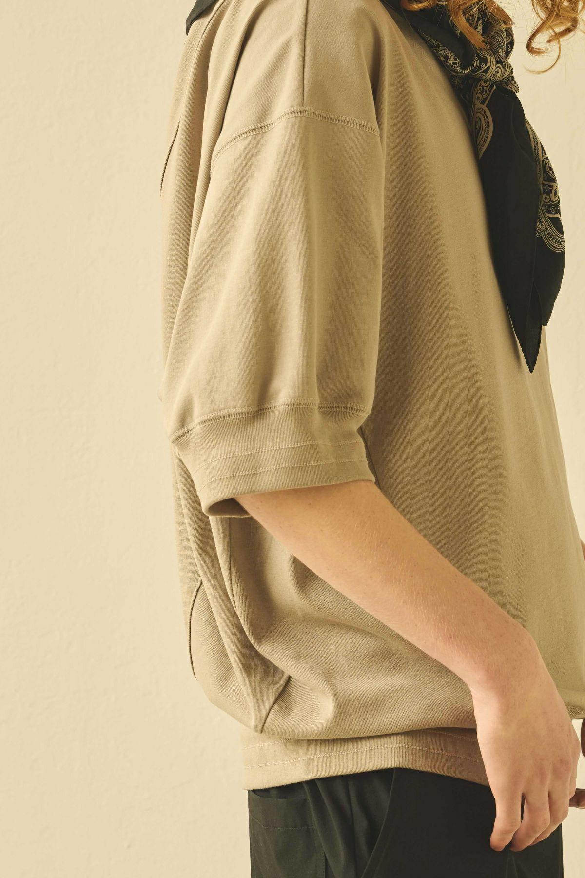 左サイドに大胆に切り替えをいれたワイドシルエットの1枚。