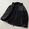 摩擦が起きやすい肘や胸部がナイロンの切り替えになっており、ミドルレイヤーのフリースジャケットながら、単体のアウターとしても着られる完成度の高いジャケットです。