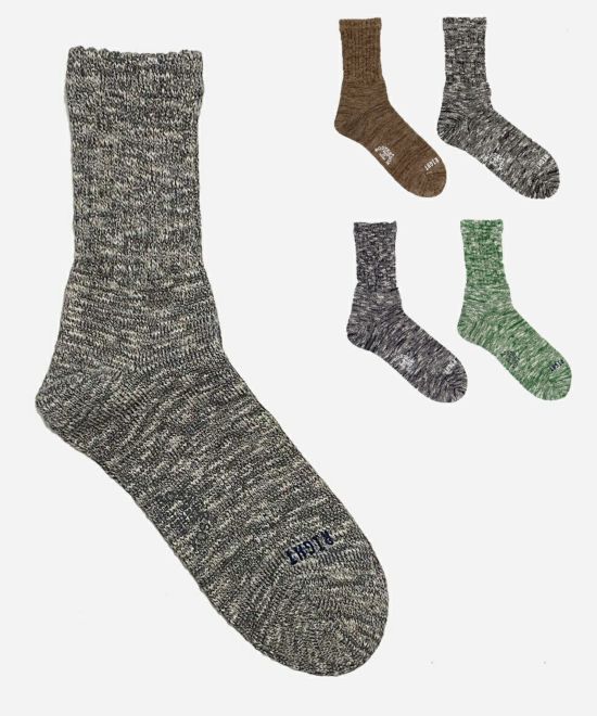 旧式のB式機というオールドマシーンのパイル機で編んだローゲージソックスです。シンプルですが風合いのある仕上がりが特徴的。 綿の糸に綿のスラブ糸を混ぜてた拘りを感じる靴下。